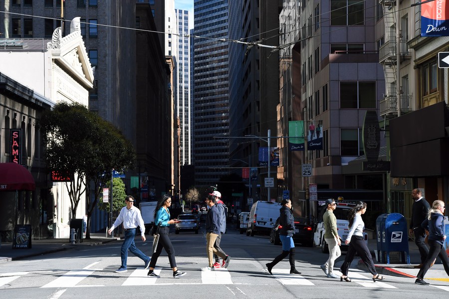People walk across a street in San Francisco, the United States, on Nov. 13, 2023. (Xinhua/Li Rui)