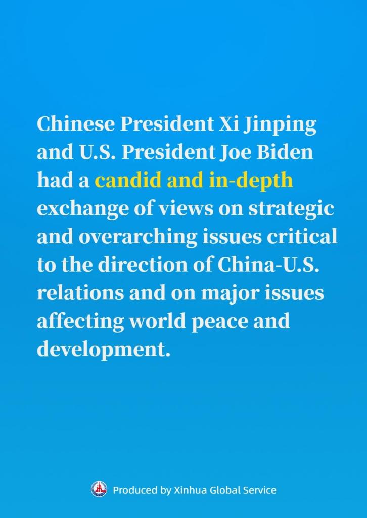 Chinese President Xi Jinping and his U.S. counterpart Joe Biden on Wednesday had a candid and in-depth exchange of views on strategic and overarching issues critical to the direction of China-U.S. relations and on major issues affecting world peace and development during a summit at Filoli Estate, California.