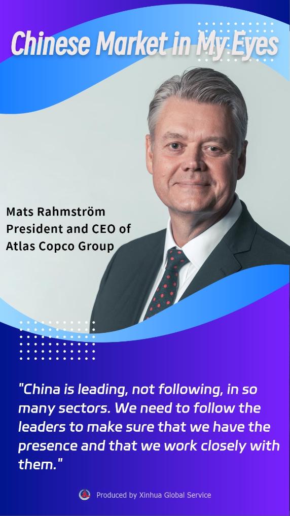 "China is leading, not following, in so many sectors. We need to follow the leaders to make sure that we have the presence and that we work closely with them," Mats Rahmström, president and CEO of Atlas Copco Group, told Xinhua in an interview during his recent trip to China.