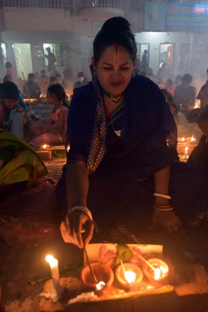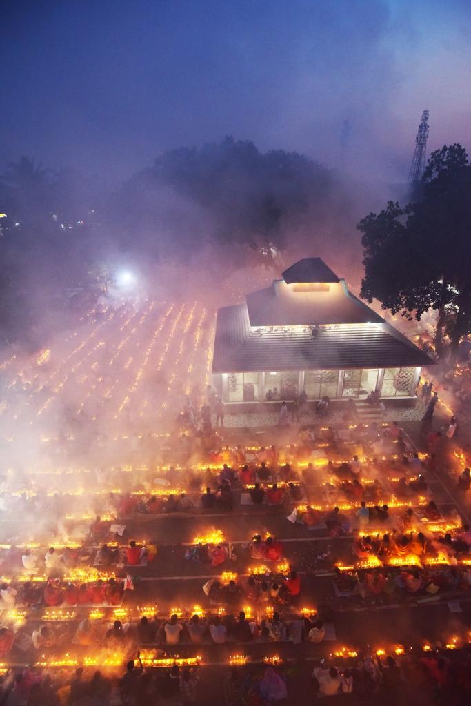At a local temple, devotees sat for prayer with burning incense and lit oil lamps.
