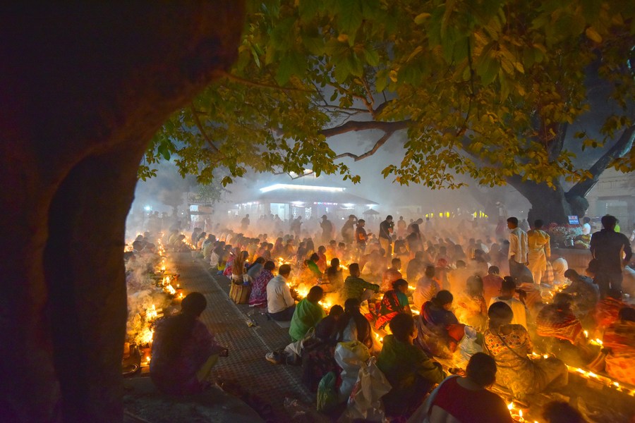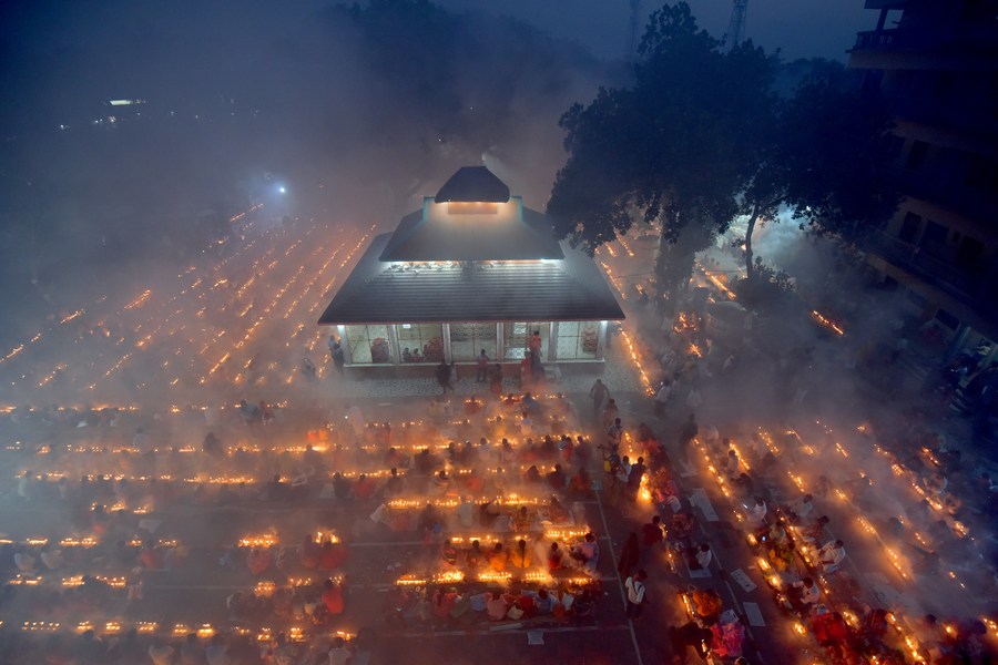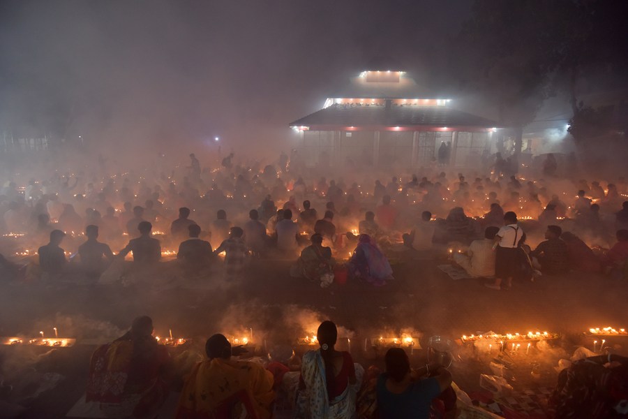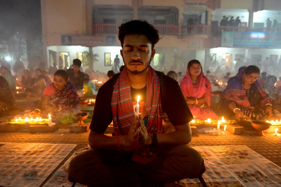Devotees sit for prayer with burning incense and lit oil lamps during the Rakher Upobash, a religious fasting festival, at a temple in Narayanganj, Bangladesh, on Nov. 14, 2023. (Xinhua)