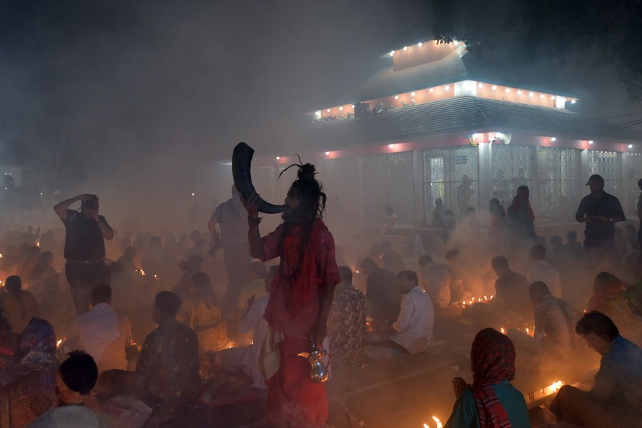 A devotee blows a horn instrument during the Rakher Upobash, a religious fasting festival, at a temple in Narayanganj, Bangladesh on Nov. 14, 2023. (Xinhua)