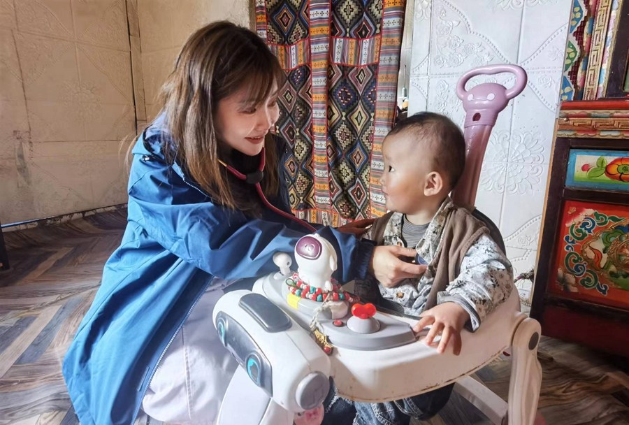 Zheng Wanqi, a pediatrician from northeast China's Liaoning Province, conducts a follow-up visit to a baby in the pastoral area of Nagqu, southwest China's Xizang Autonomous Region, Sept. 16, 2023. (Xinhua/Liu Zhoupeng)