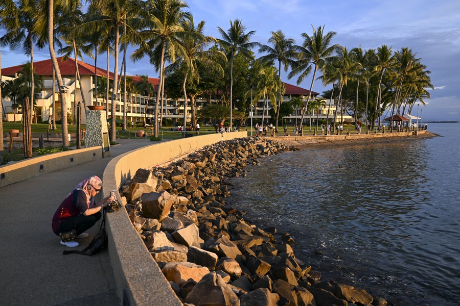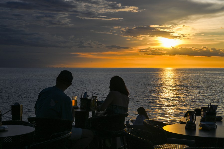 People enjoy the sunset at a cafe near the seaside in Kota Kinabalu, Sabah, Malaysia, Nov. 14, 2023. (Xinhua/Cheng Yiheng)