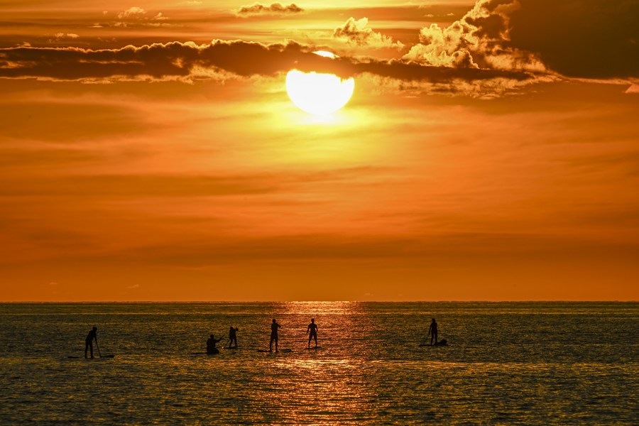 People enjoy themselves on the sea at sunset in Kota Kinabalu, Sabah, Malaysia, Nov. 14, 2023. (Xinhua/Cheng Yiheng)