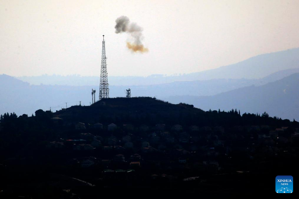 Photo taken on Nov. 16, 2023 from Marjayoun, Lebanon, shows a missile fired by Hezbollah striking a military observation tower at the Israeli military site of Metula. Confrontations on the Lebanon-Israel border continued on Thursday. (Photo by Ali Hashisho/Xinhua)