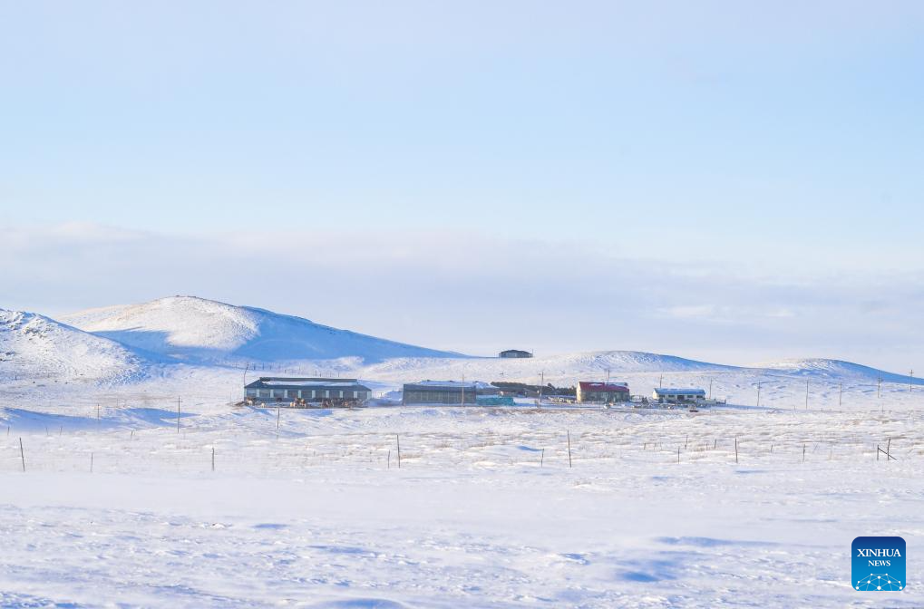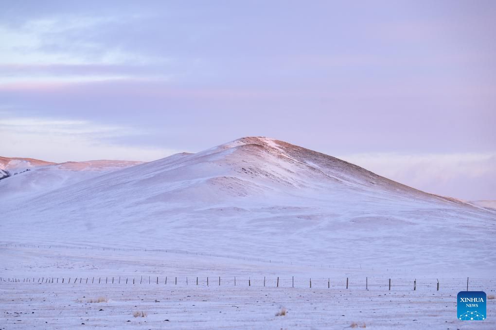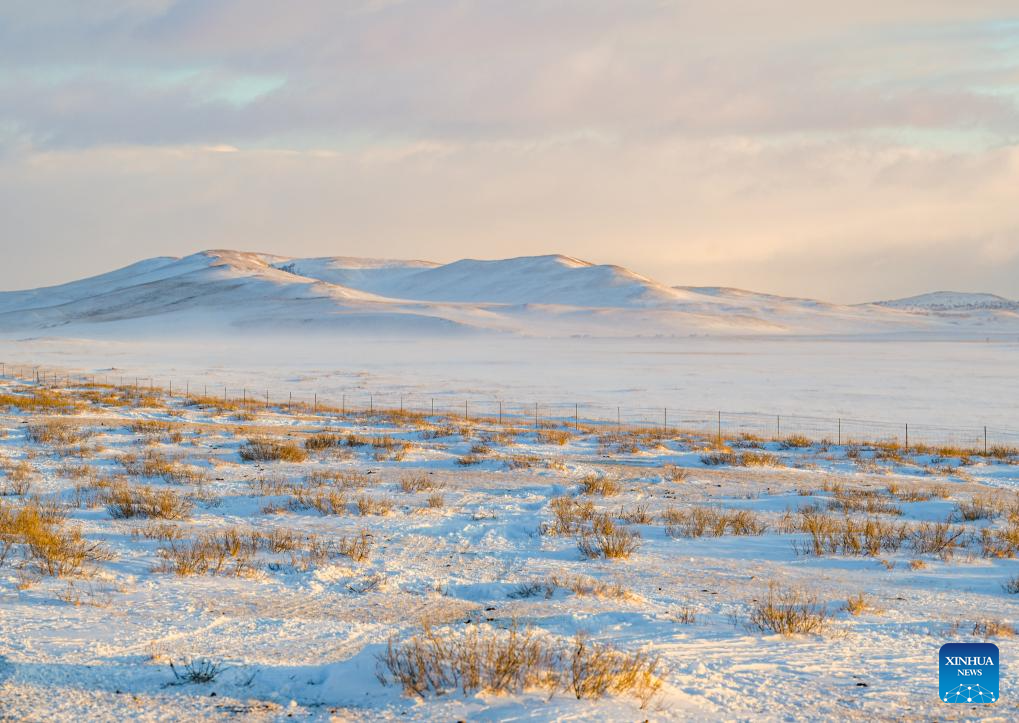 This photo taken on Nov. 16, 2023 shows snow-covered Ujimqin grasslands in West Ujimqin Banner of Xilingol League, north China's Inner Mongolia Autonomous Region. (Xinhua/Peng Yuan)