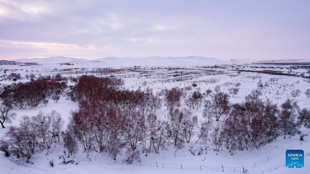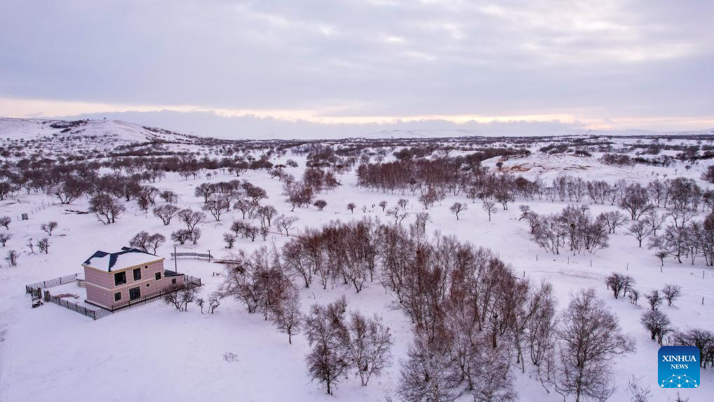 This aerial photo taken on Nov. 16, 2023 shows groves on the snow-covered Ujimqin grasslands in West Ujimqin Banner of Xilingol League, north China's Inner Mongolia Autonomous Region. (Xinhua/Peng Yuan)