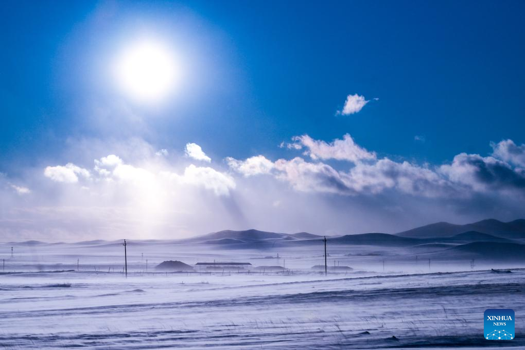 This photo taken on Nov. 16, 2023 shows snow thrown up by high wind on the Ujimqin grasslands in West Ujimqin Banner of Xilingol League, north China's Inner Mongolia Autonomous Region. (Xinhua/Peng Yuan)
