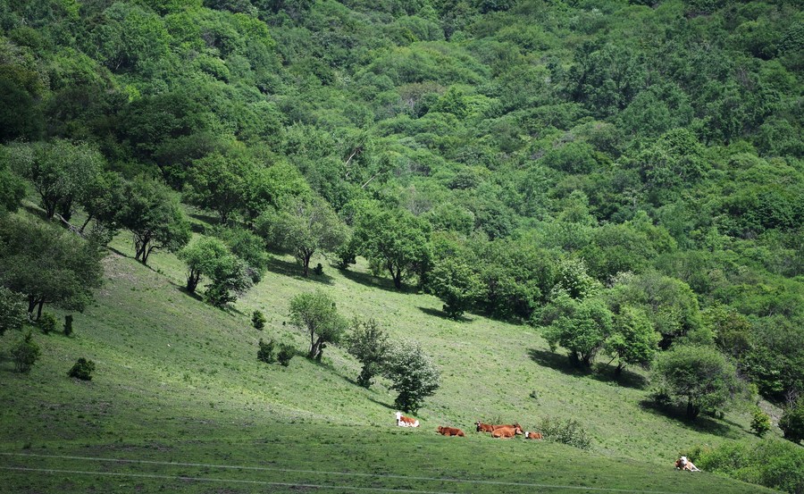Cattle rest on grassland at a forest farm of Guanshan Mountains in Zhangjiachuan Hui Autonomous County of Tianshui, northwest China's Gansu Province, June 7, 2022. (Xinhua/Chen Bin)