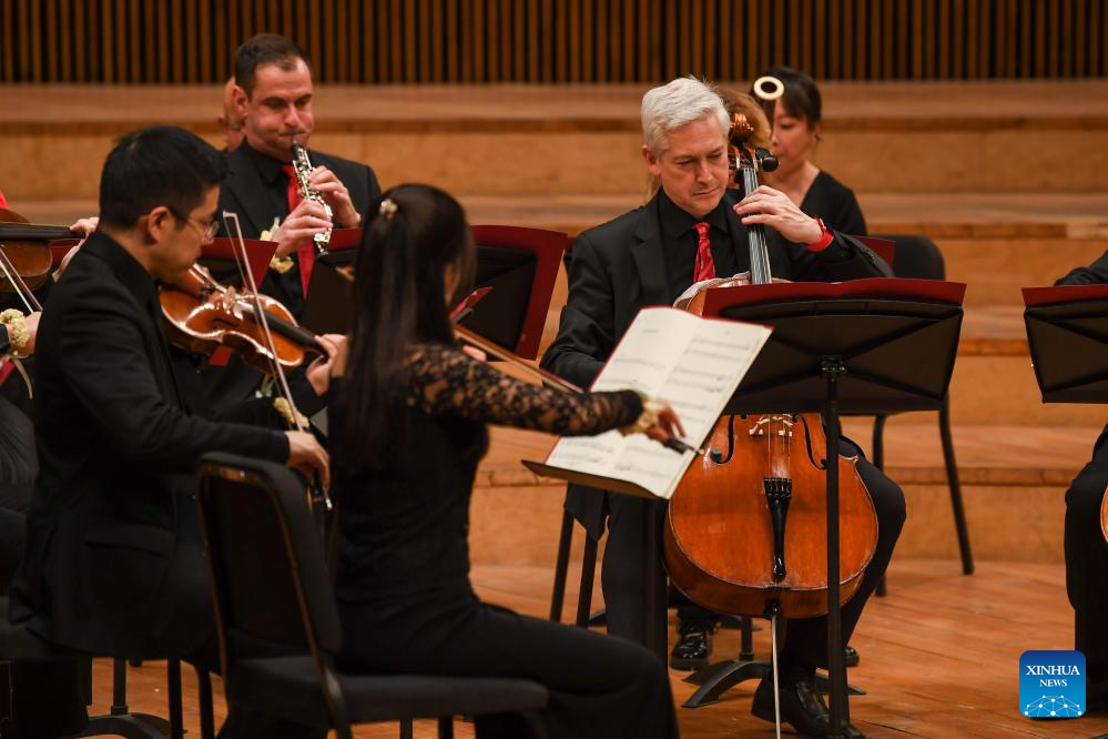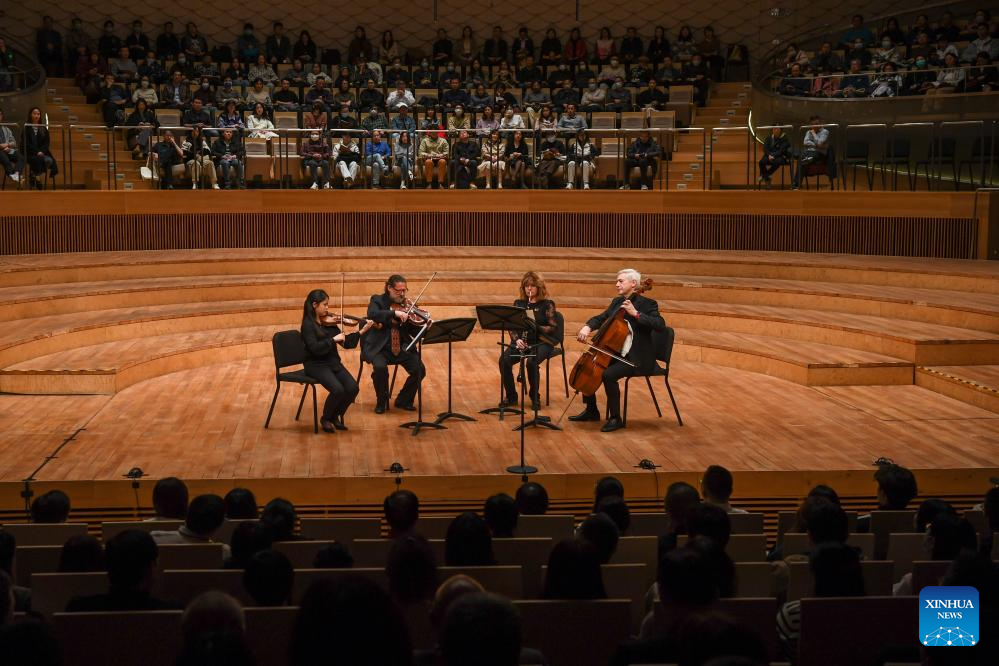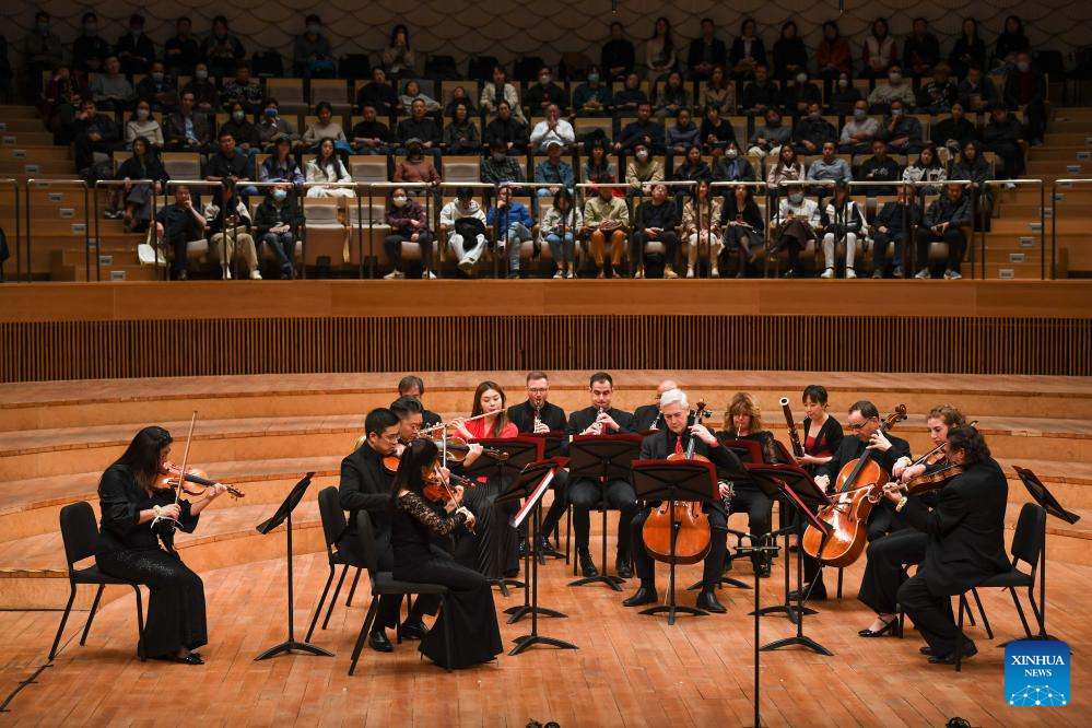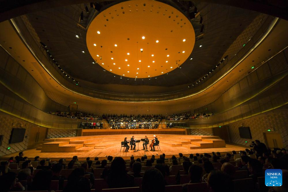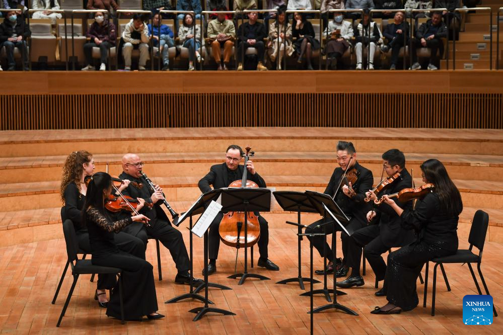 This photo taken on Nov. 16, 2023 shows a concert in Suzhou, east China's Jiangsu Province. Musicians from the Philadelphia Orchestra and Suzhou Symphony Orchestra jointly staged a chamber concert here on Thursday. (Xinhua/Li Bo)