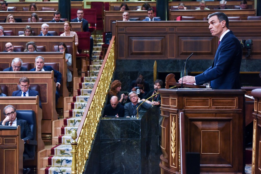 Spanish Socialist Workers' Party (PSOE) leader Pedro Sanchez gives a speech during the investiture debate in Madrid, Spain, on Nov. 15, 2023. The Congress of Deputies (Parliament) started Wednesday the second debate on the investiture of Sanchez as the country's next prime minister following the July 23 general election. (Xinhua/Meng Dingbo)
