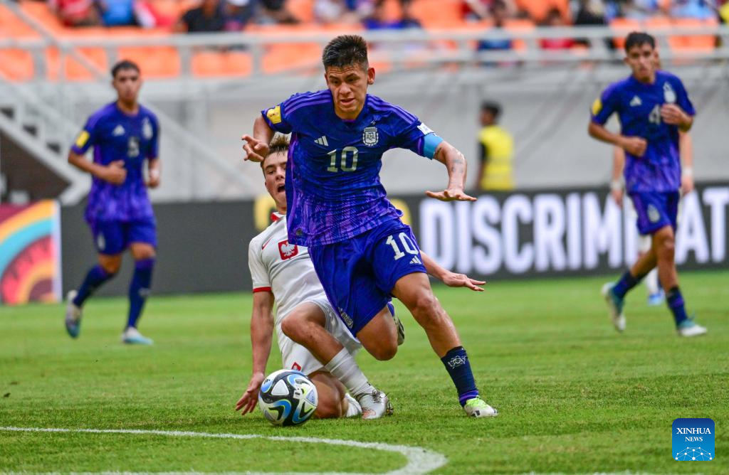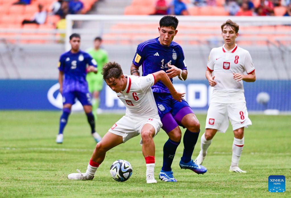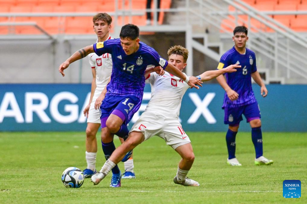 Agustin Ruberto (R) of Argentina competes with Maksymilian Sznaucner of Poland during the group D match of the FIFA World Cup U17 in Jakarta, Indonesia, Nov. 17, 2023. (Xinhua/Zulkarnain)
