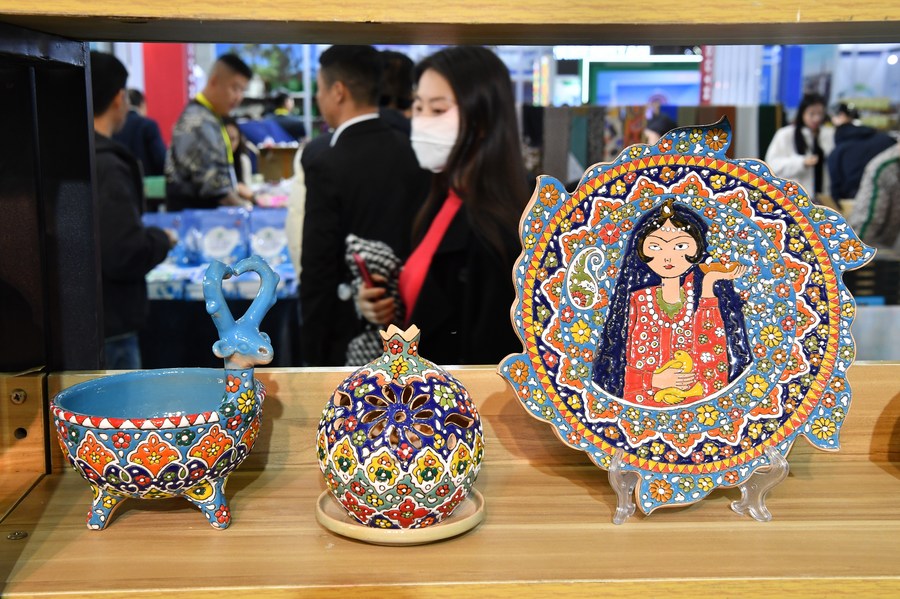 Handicrafts are exhibited at the booth of Iran during the Seventh Silk Road International Exposition in Xi'an City, northwest China's Shaanxi Province, Nov. 16, 2023. (Xinhua/Shao Rui)