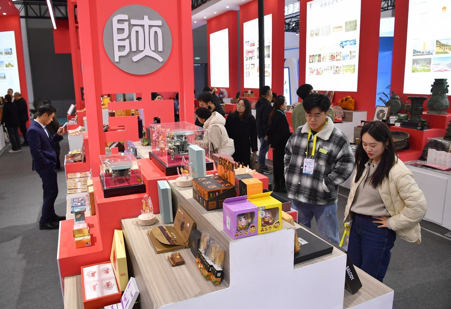 Visitors view cultural and creative products at the booth of northwest China's Shaanxi Province during the Seventh Silk Road International Exposition in Xi'an City of Shaanxi, Nov. 16, 2023. (Xinhua/Shao Rui)