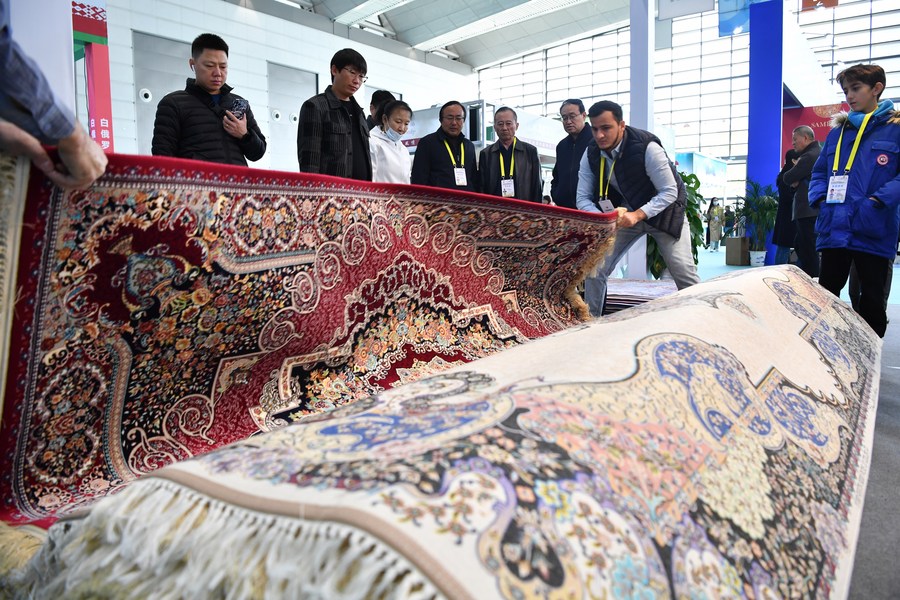 Visitors select carpets at the booth of Iran during the Seventh Silk Road International Exposition in Xi'an City, northwest China's Shaanxi Province, Nov. 16, 2023. (Xinhua/Shao Rui)■