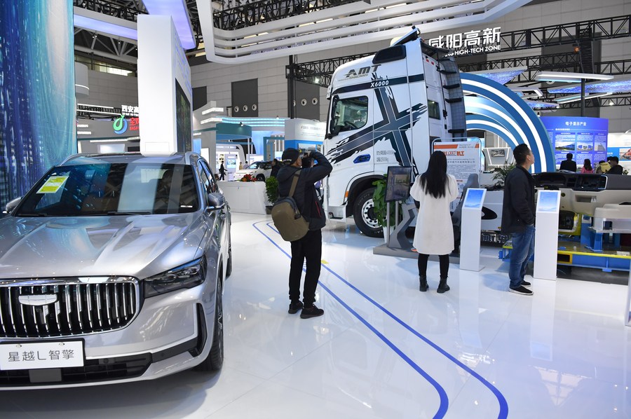 New-energy vehicle and heavy truck products of domestic brands are exhibited during the Seventh Silk Road International Exposition in Xi'an City, northwest China's Shaanxi Province, Nov. 16, 2023. (Xinhua/Shao Rui)