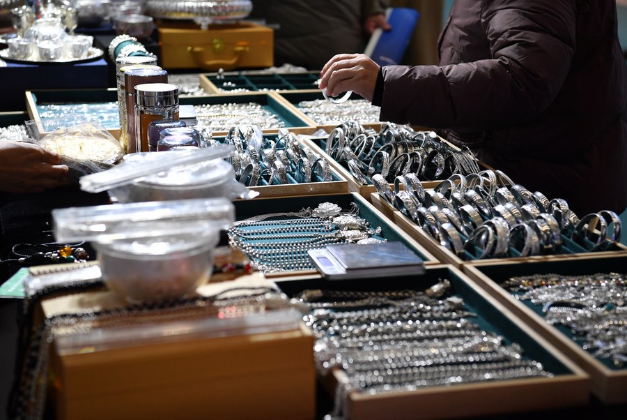 A visitor selects handicrafts at the booth of Sudan during the Seventh Silk Road International Exposition in Xi'an City, northwest China's Shaanxi Province, Nov. 16, 2023. (Xinhua/Shao Rui)