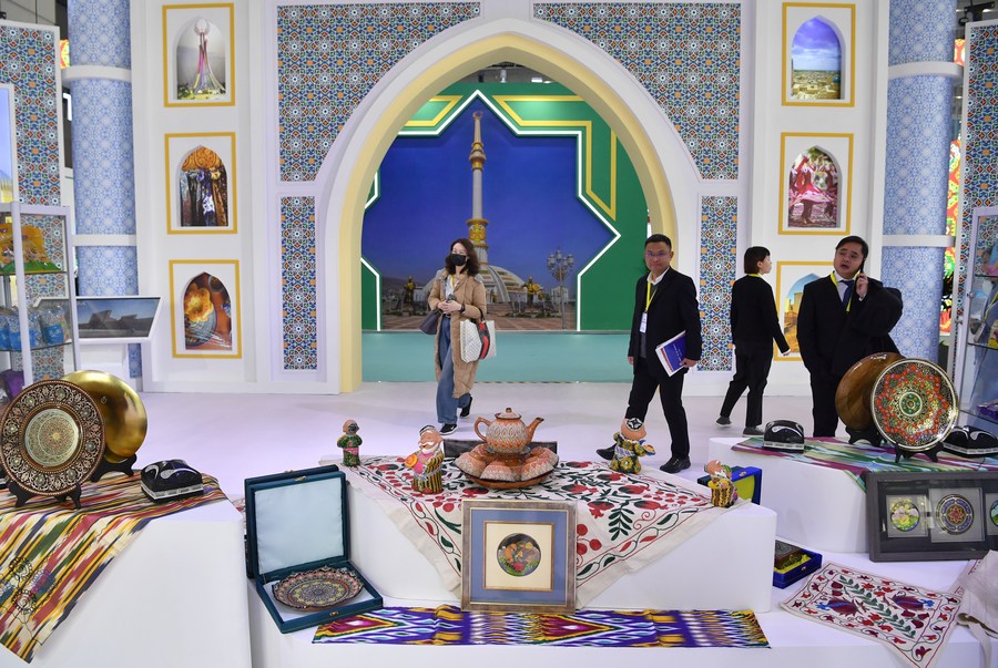 Visitors are seen at the booth of Uzbekistan during the Seventh Silk Road International Exposition in Xi'an City, northwest China's Shaanxi Province, Nov. 16, 2023. (Xinhua/Shao Rui)