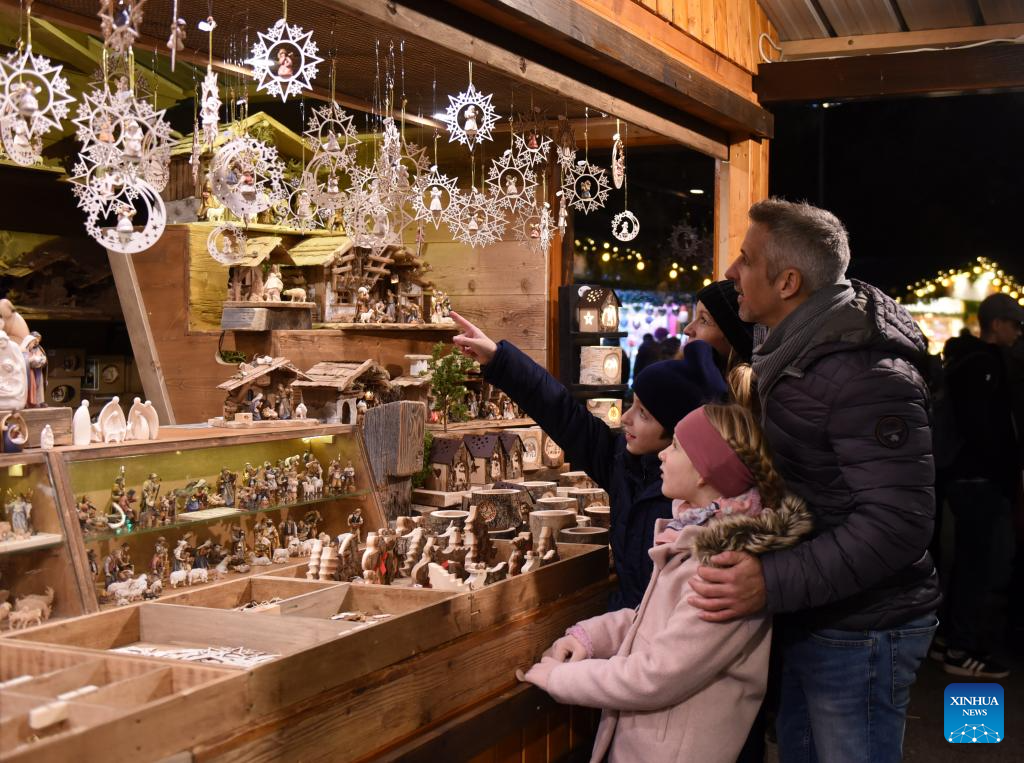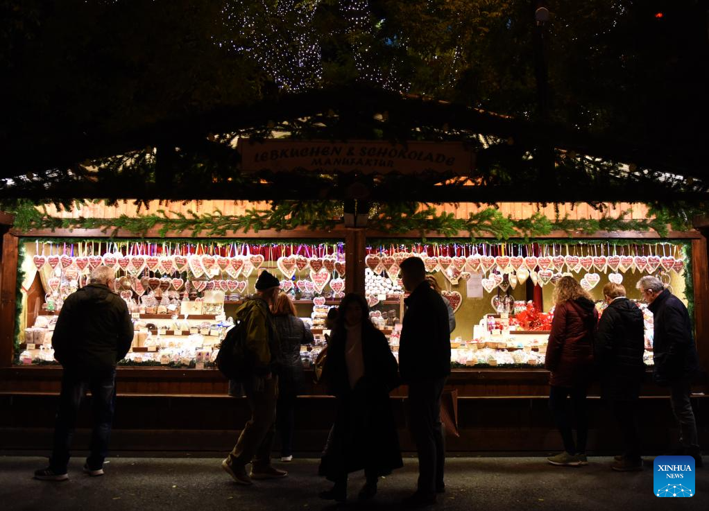 People select Christmas ornaments at a Christmas market in Vienna's Rathausplatz, Austria, Nov. 16, 2023. (Photo by Han Lu/Xinhua)