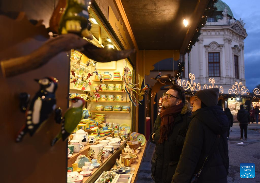 People select Christmas ornaments at the Christmas market of Belvedere, Vienna, Austria, Nov. 17, 2023. (Photo by Han Lu/Xinhua)