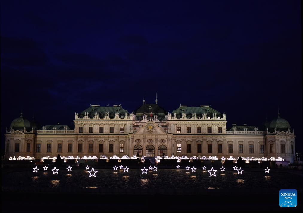 This photo taken on Nov. 17, 2023 shows a view of the illuminated Upper Belvedere and the Christmas market of Belvedere in Vienna, Austria. (Photo by Han Lu/Xinhua)