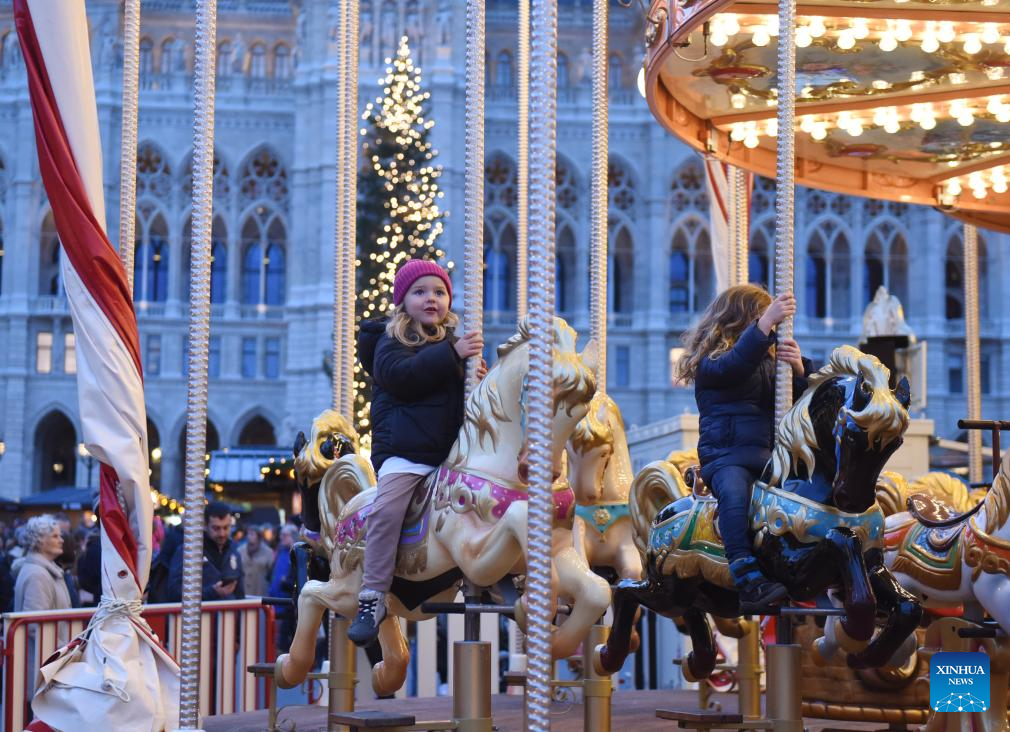 Children enjoy carousel at a Christmas market in Vienna's Rathausplatz, Austria, Nov. 16, 2023. (Photo by Han Lu/Xinhua)