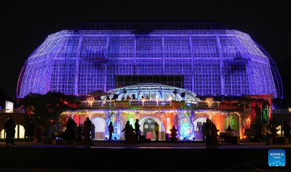 Visitors look at light decorations during the "Christmas Garden Berlin" light show at the Botanical Garden in Berlin, Germany, Nov. 17, 2023. The "Christmas Garden Berlin" kicked off on Friday here and will last until Jan. 14, 2024. (Photo by Stefan Zeitz/Xinhua)