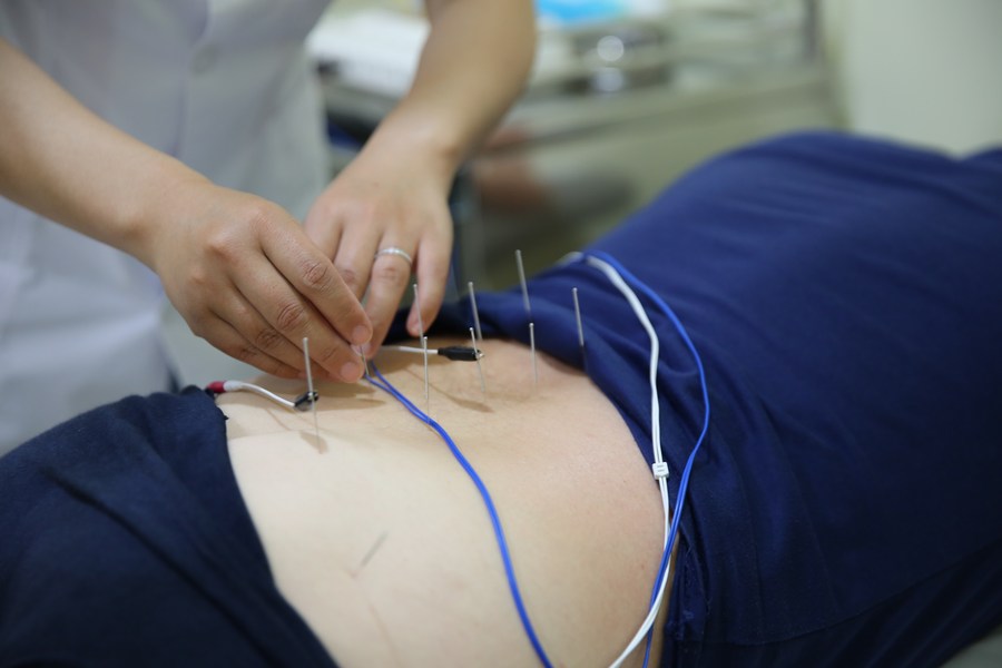 A patient receives acupuncture treatment at the Mediterranean Regional Center for Traditional Chinese Medicine (MRCTCM) in Paola, Malta, April 27, 2021. (Xinhua/Chen Wenxian)