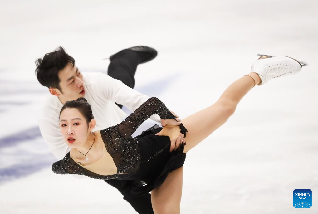 Peng Cheng (front)/ Wang Lei of China perform during the Pairs free skating at the ISU Grand Prix of figure skating 2023 Grand Prix Espoo in Espoo, Finland, Nov. 18, 2023. (Photo by Kalle Parkkinen/Xinhua)