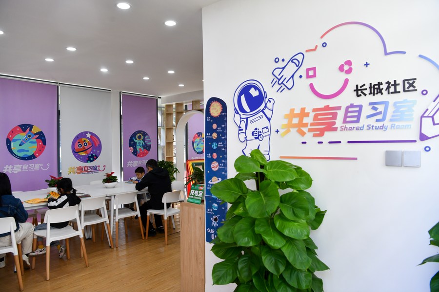 Children and their parents read books at a shared study room in Changcheng community in Baihua Child-friendly Block of Futian District in Shenzhen, south China's Guangdong Province, Nov. 18, 2023. (Xinhua/Liang Xu)