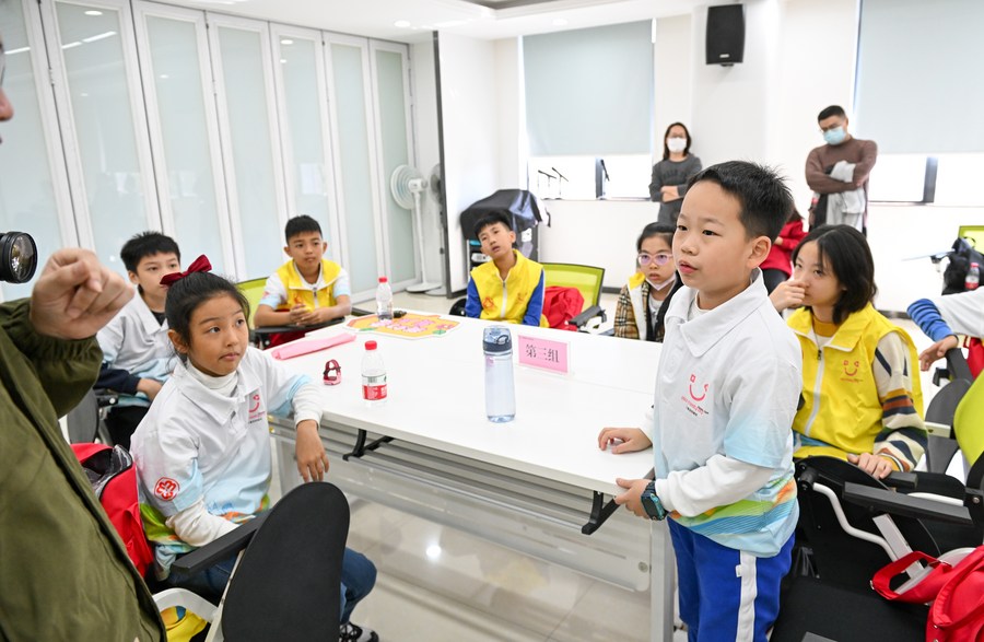 Members of a children's deliberation organization are engaged in a discussion on child-friendly measures and behaviors at the women's and children's activity center of Luohu District in Shenzhen, south China's Guangdong Province, Nov. 18, 2023. (Xinhua/Mao Siqian)