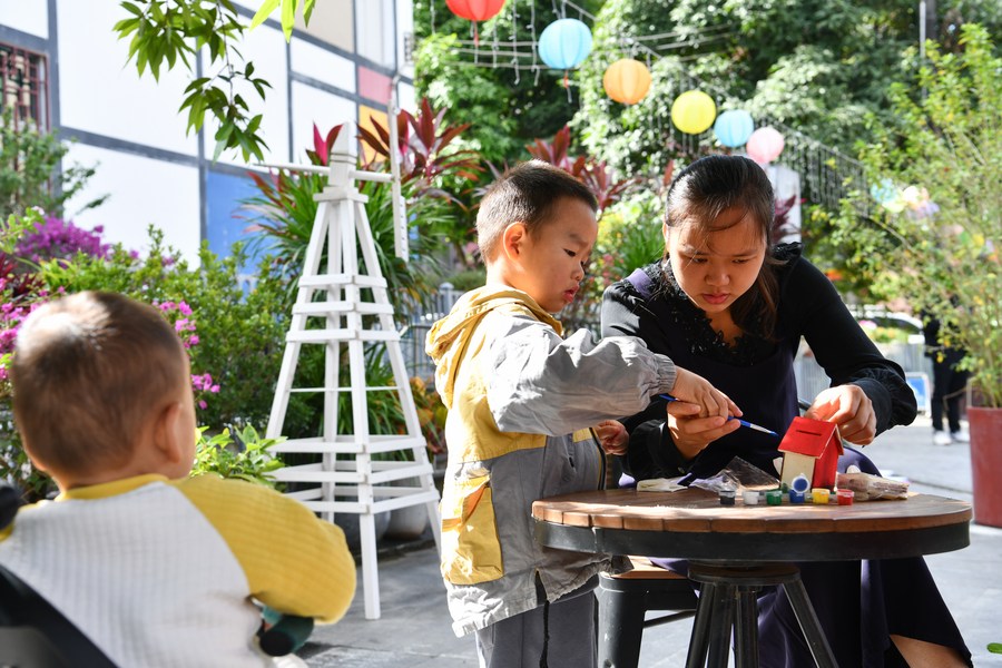 A mother does handwork with her child in Shangwei Village, a child-friendly arts village, in Longhua District of Shenzhen, south China's Guangdong Province, Nov. 19, 2023. (Xinhua/Liang Xu)