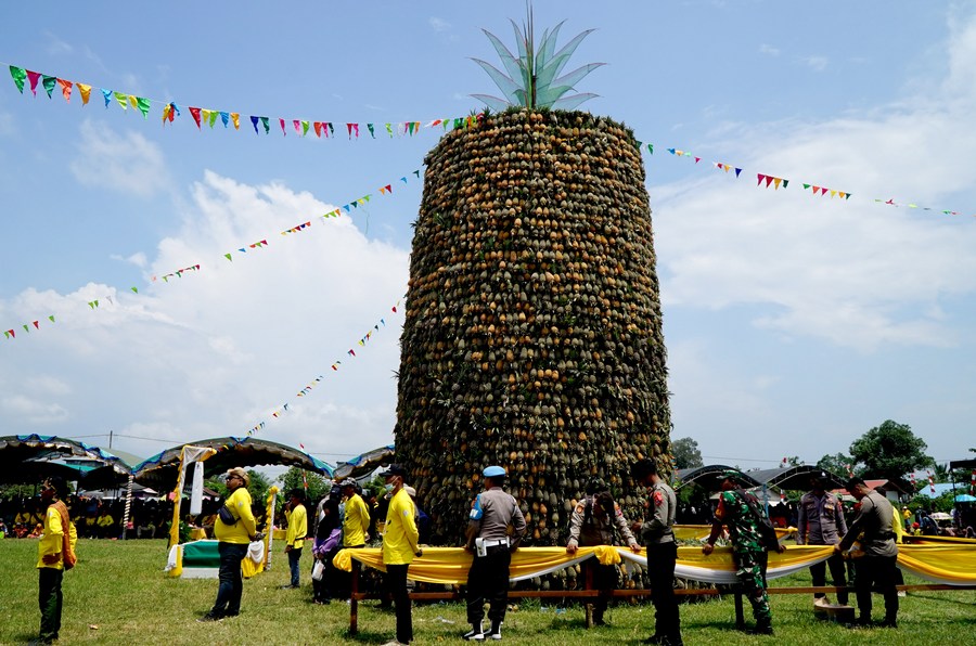 A giant "pineapple" built with thousands of pineapples is pictured during a pineapple festival in Tamban Raya village in Barito Kuala district, South Kalimantan, Indonesia, Nov. 19, 2023. (Photo by Bahaudin/Xinhua)