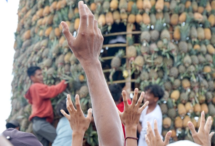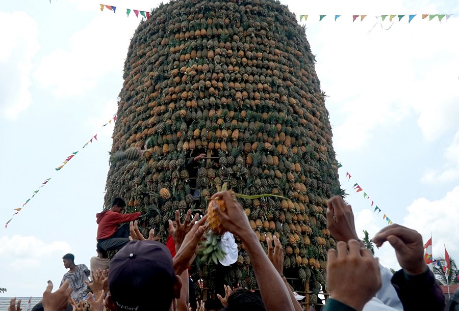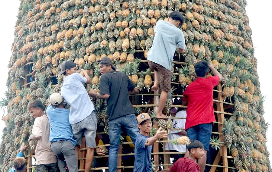 People climb a giant "pineapple" built with thousands of pineapples during a pineapple festival in Tamban Raya village in Barito Kuala district, South Kalimantan, Indonesia, Nov. 19, 2023. (Photo by Bahaudin/Xinhua)