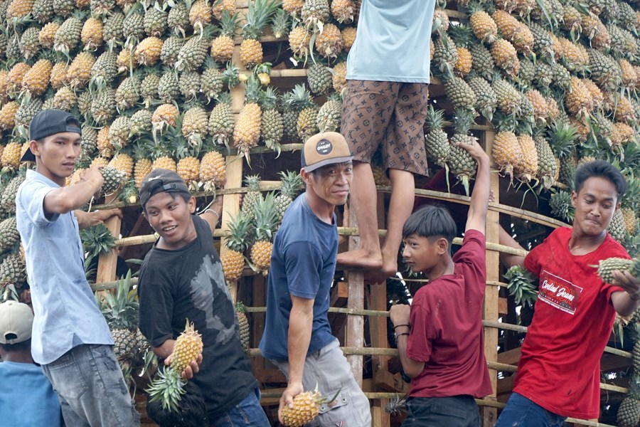 People hold pineapples during a pineapple festival in Tamban Raya village in Barito Kuala district, South Kalimantan, Indonesia, Nov. 19, 2023. (Photo by Bahaudin/Xinhua)