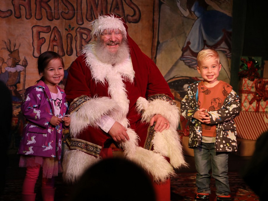 An actor dressed in Santa Claus costume poses for photos with children during the Great Dickens Christmas Fair in San Francisco, the United States, Nov. 18, 2023. The Great Dickens Christmas Fair, which was first held in 1970, opened in San Francisco on Saturday. The fair is aimed at attracting people to enjoy the culture of the Victorian era by recalling the characters and scenes in the works of British novelist Charles Dickens. (Photo by Liu Yilin/Xinhua)