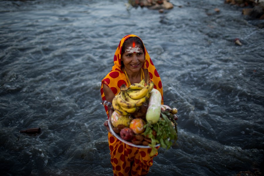 A devotee worships the setting Sun during the Chhath festival in Lalitpur, Nepal, Nov. 19, 2023. The Chhath festival is dedicated to the Sun with devotees making offerings to the setting and rising Sun. (Photo by Sulav Shrestha/Xinhua)