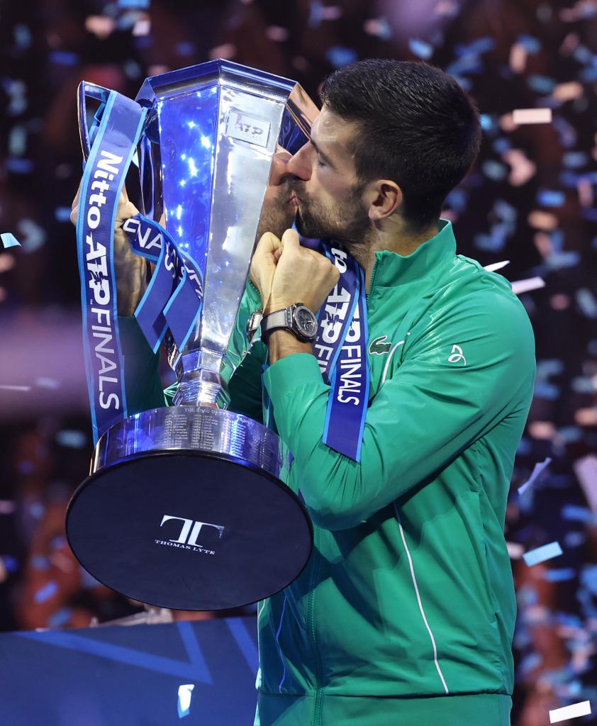 This photo taken on Nov. 20, 2023 shows Novak Djokovic kisses the trophy. Novak Djokovic of Serbia beat Jannik Sinner of Italy 2-0 to win the singles final of the ATP year-end finals in Turin, Italy, Nov. 20, 2023. (Photo by Alberto Lingria/Xinhua)