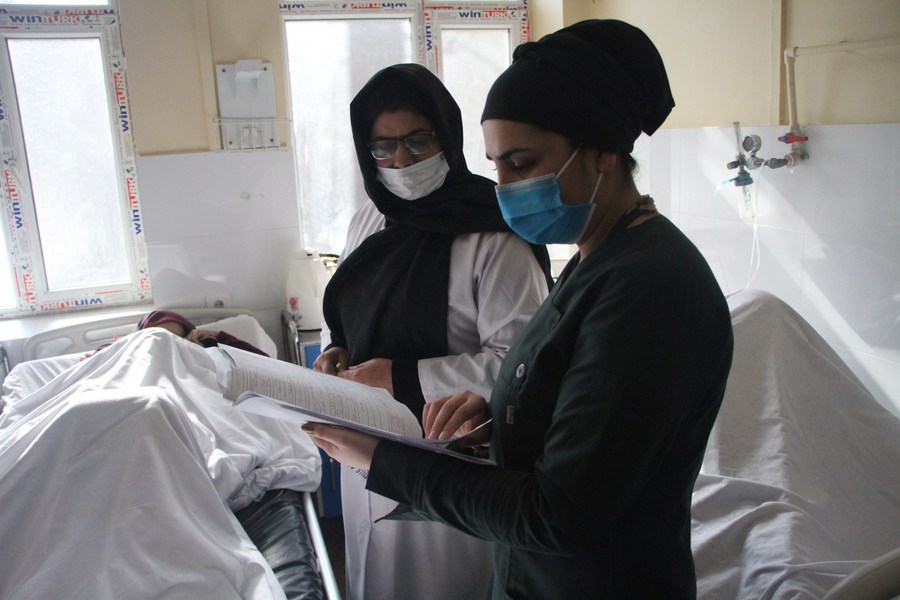 Malalai Rahim Faizi (2nd R), the physician-in-chief of Afghanistan's biggest maternity hospital, visits a patient at the Malalai Zizhanton Hospital in Kabul, Afghanistan, on Feb. 8, 2022. (Photo by Saifurahman Safi/Xinhua)