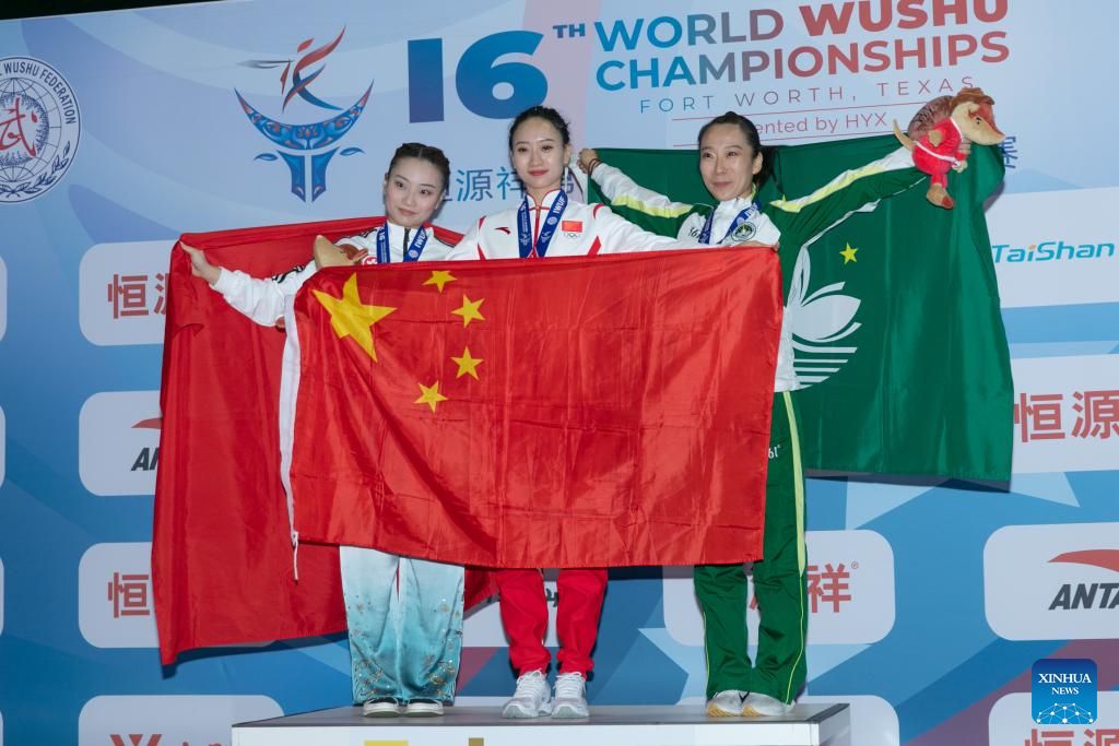 Gold medalist Yao Yang (C) of China poses during the awarding ceremony for the women's Jianshu event at the 16th World Wushu Championships (WWC) in Fort Worth, Texas, the United States, on Nov. 19, 2023. (Photo by Dan Tian/Xinhua)
