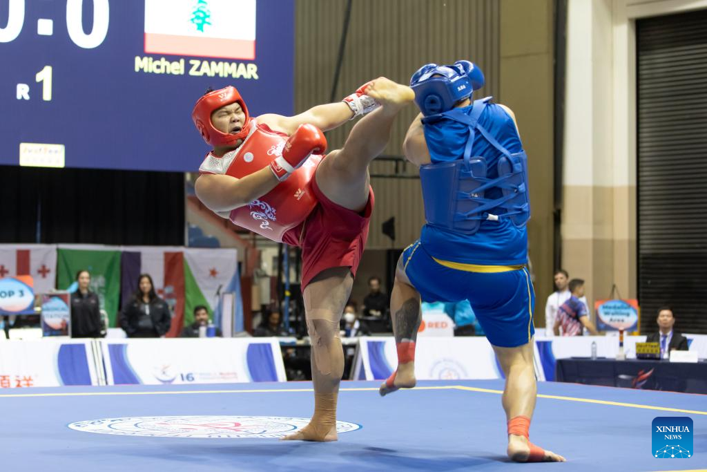Ye Xiang (L) of China and Michel Zammar of Lebanon compete in the men's +90kg Sanda event at the 16th World Wushu Championships (WWC) in Fort Worth, Texas, the United States, on Nov. 19, 2023. (Photo by Dan Tian/Xinhua)