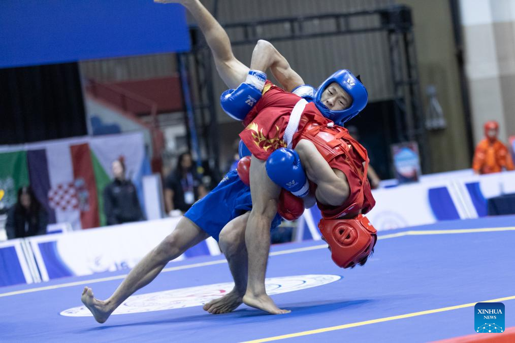Tang Sishuo (Rear) of China competes with Dinh Van Tam of Vietnam during the men's 52kg Sanda event at the 16th World Wushu Championships (WWC) in Fort Worth, Texas, the United States, on Nov. 19, 2023. (Photo by Dan Tian/Xinhua)