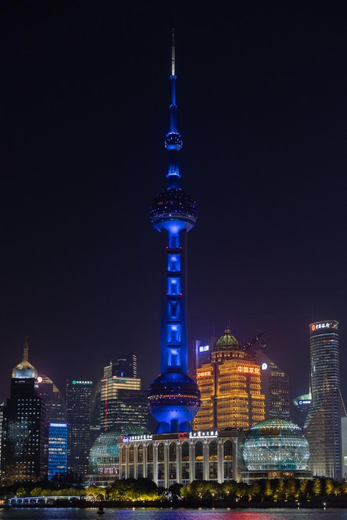 Landmarks are lit up to celebrate World Children's Day in Lujiazui area in east China's Shanghai, Nov. 20, 2023. (Xinhua/Wang Xiang)