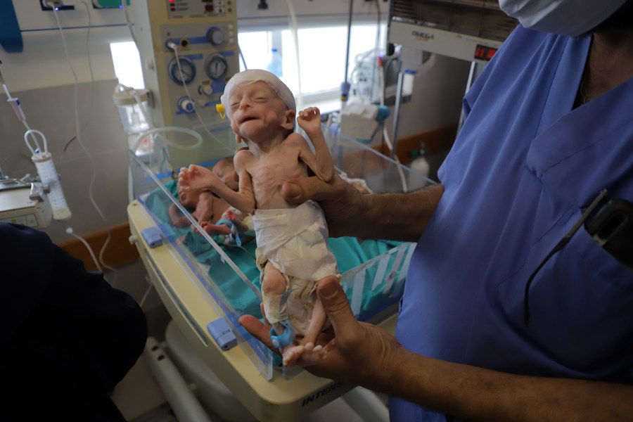 The newborns, in rapidly deteriorating condition, were at imminent risk of death, following the tragic death of several other babies and the total collapse of all medical services at Al-Shifa, the UN Children's Fund said in a statement. (Photo by Rizek Abdeljawad/Xinhua)