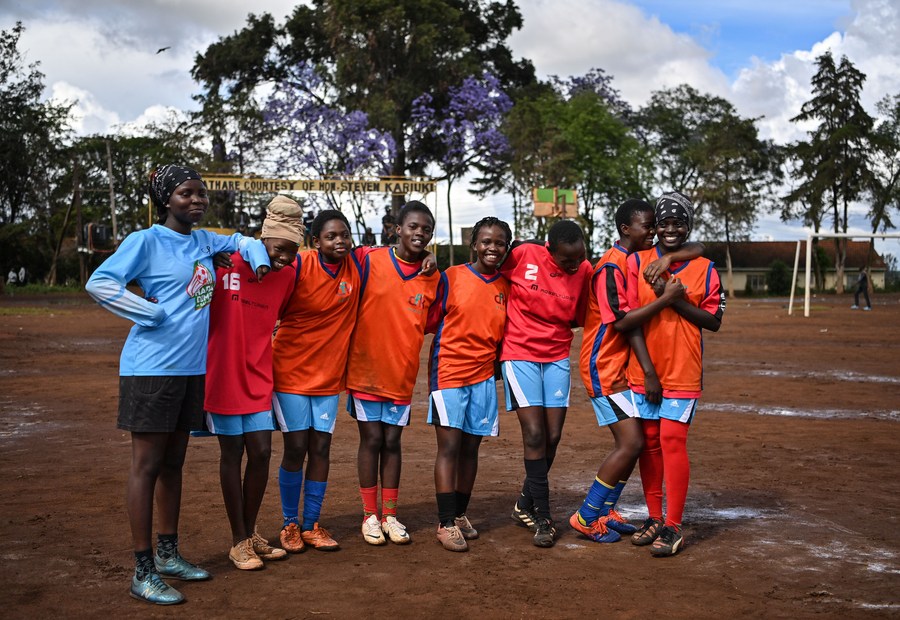 Players are seen before a match at Mathare slums in Nairobi, Kenya, Nov 18, 2023. On the occasion of World Children's Day, two girls football teams from MCEDO Beijing School, with an average age of about 14, engaged in a match Saturday at Mathare slum in Nairobi, the capital of Kenya. MCEDO Beijing School was constructed with the assistance of Embassy of China in Kenya in 2007 and underwent a expansion project in 2012, funded by donations from member enterprises organized by the Kenya China Economic and Trade Association (KCETA). (Xinhua/Han Xu)