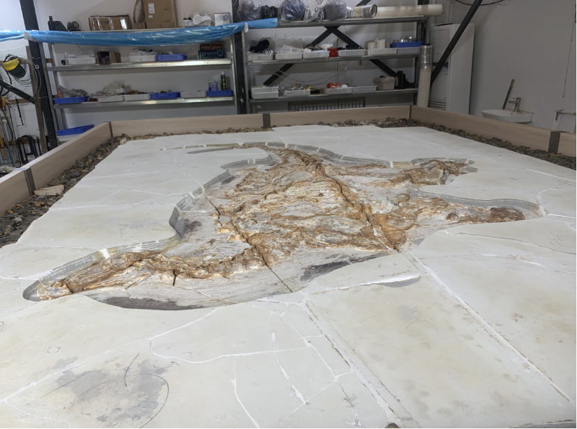 This photo taken on July 20, 2023 shows fossils of a Stegosaurus dinosaur uncovered during a fossil excavation and restoration project in Fengning Man Autonomous County, north China's Hebei Province. Two fossilized dinosaurs, one with almost intact skin marks, were uncovered by Chinese paleontologists during a fossil excavation and restoration project in north China's Hebei Province. (Photo by Long Qian/Xinhua)