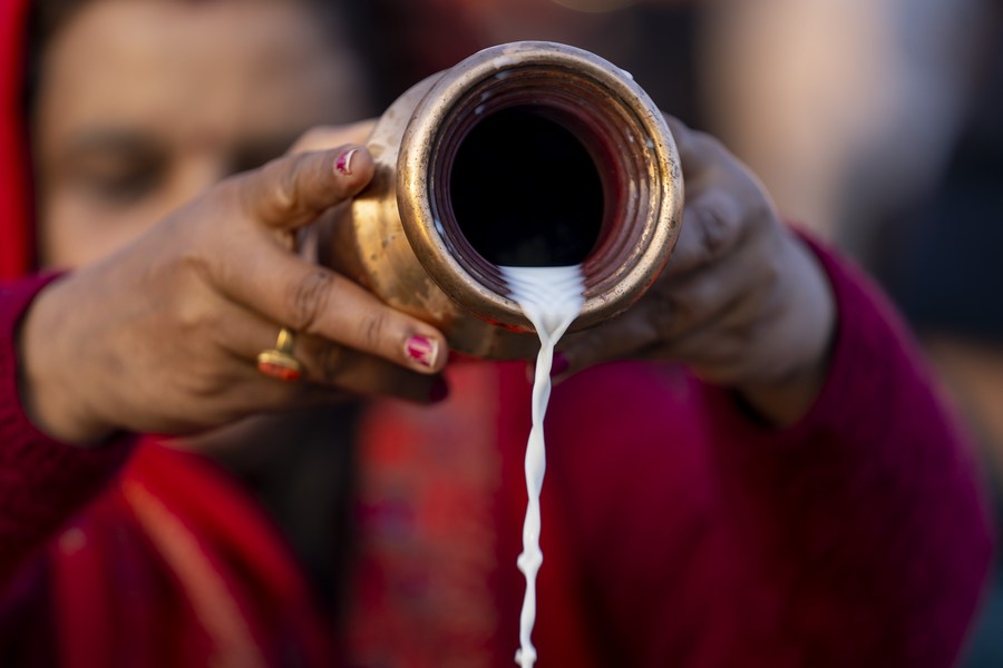 A woman makes offering to the rising sun during the Chhath festival on the bank of the Bagmati River in Kathmandu, Nepal, Nov. 20, 2023. The Chhath festival is dedicated to the Sun with devotees making offerings to the setting and rising Sun. (Photo by Hari Maharjan/Xinhua)