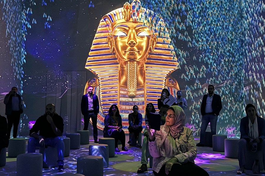 People visit Tutankhamun - The Immersive Exhibition at the Grand Egyptian Museum in Giza, Egypt, on Nov. 20, 2023. The Grand Egyptian Museum opened the immersive exhibition themed the ancient Egyptian King Tutankhamun on Monday. (Xinhua/Ahmed Gomaa)■