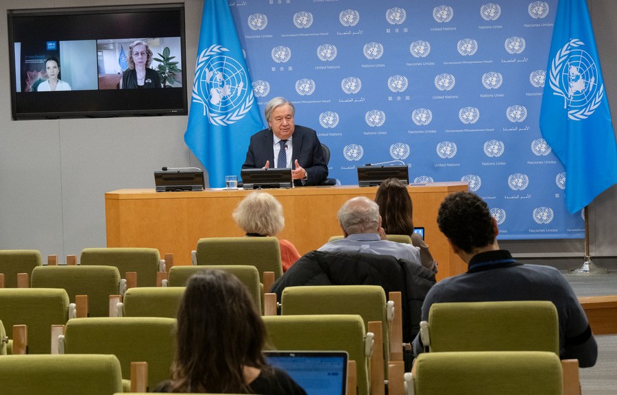 UN Secretary-General Antonio Guterres (Rear) speaks at the launch of the Emissions Gap Report 2023 of the UN Environment Programme, at the UN headquarters in New York, on Nov. 20, 2023. (Eskinder Debebe/UN Photo/Handout via Xinhua)